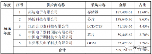 不只是聯發科這樣的國產手機處理器制造商,國產屏幕、存儲器制造商同樣能從傳音控股的發展中獲益。招股書顯示,2018 年其前五大供應商分別為拓達電子、鴻博科技、合力泰、中國電子、華貝電子,均為我國廠商。