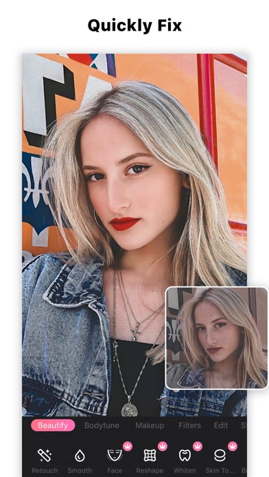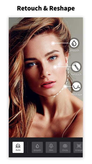 Cartoon Filter effects, Reshape body, Retouch face, smooth skin, whiten teeth and live stickers, you can get all you want in one selfie camera and editor app.